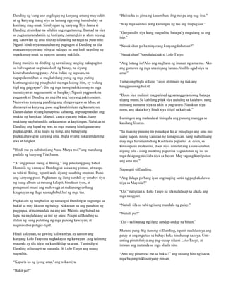 Magaan ang pagyapak ni Danding sa malambot na lupa at sinikap niyang huwag masaling maging ang pinakamaliit na halaman. Mga kaalampay na panganib sa kalusugan. Nabakas ni Danding ang lapad ng noo sa mga matang hindi ganap ang pagkakapikit at sa hugis ng ilong ang bahagyang pagkakahawig sa kanyang ama.