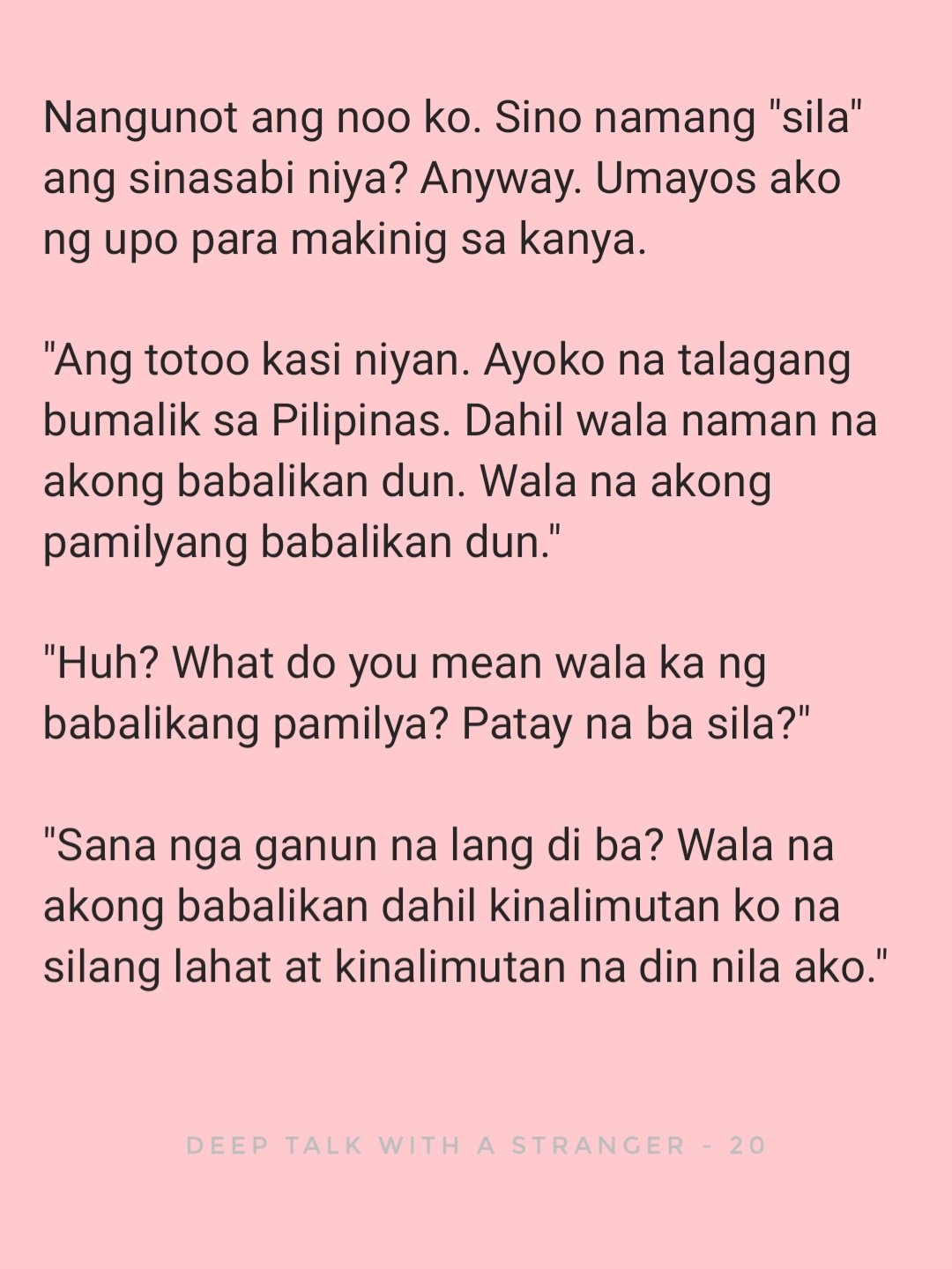 At muli na namang naantig ang aking damdamin. Ipaliwanag na maaari nilang sabihin sa mga salita kung ano ang nararamdaman nila sa halip na umiyak o maligalig. Tumawag ng taxi si James para makapunta na kami sa bahay ng kapatid nya.