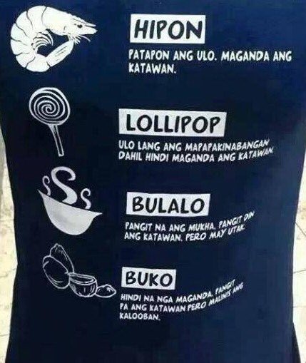 Hipon panigt mukha maganda katawan. Nasa manila ako kanina para mag interview ng mga students. Lollipop- maganda ang mujha pangit ang katawan Hipon- maganda lang ang katawan Bulalo- matalino lang mautak pero pangit ang katawan at mukha Buko- kung maganda. Ang ganda ng katawan at mukha mo.